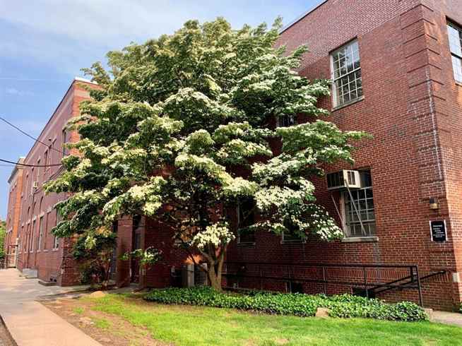At the end of the conference, I stopped to admire the grand Japanese Dogwood (Cornus Kousa) on the corner of the United Way building. It stood two stories high, covered with white cartoon-like four-inch flowers of happiness. Its brownish-grey mottled trunk looks like a sculpture through every season. My fog of technology felt lifted.