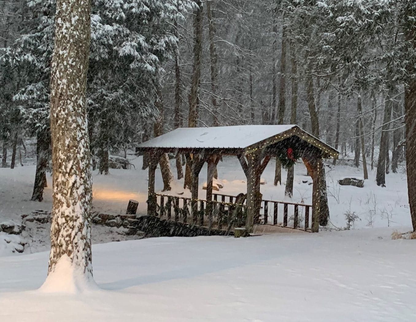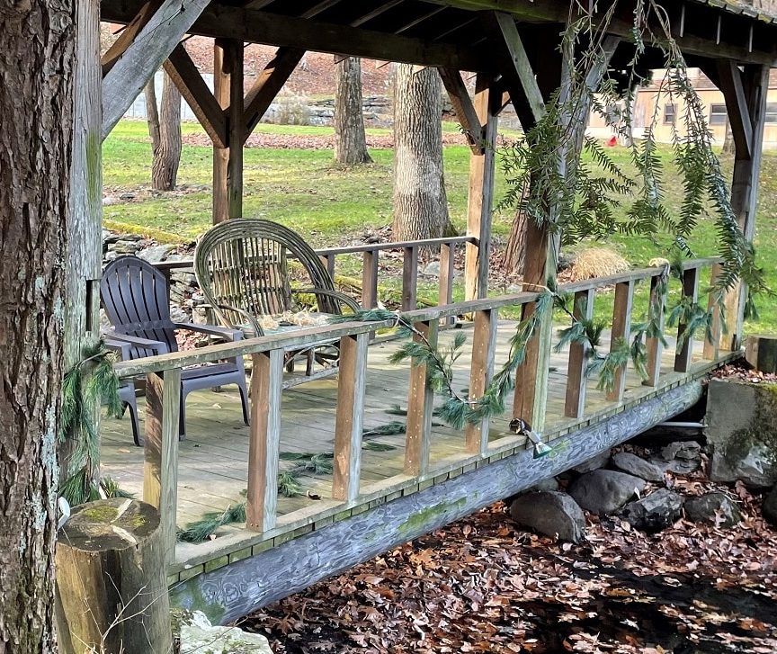 The garland unfurled to be only twenty feet rather than the customary twenty-five to cover the span of the footbridge over the pond. Kind of like crackers sold in the same size box, but weighing less and costing more, I giggled. Good thing I bought two lengths.