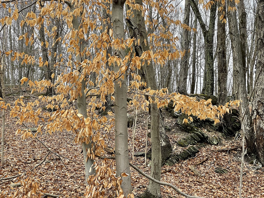 tan beech leaves in winter on smooth barked trees