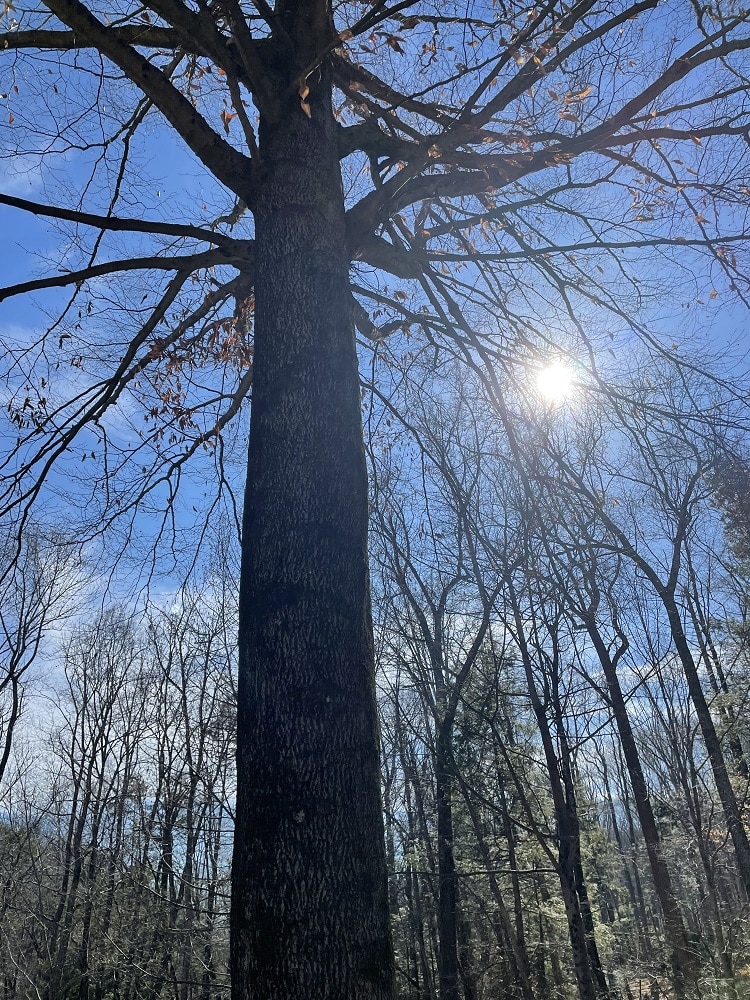my beloved beech tree without leaves with the sun gleaming through branches. Why wintertime is a favorite time for my beloved beech