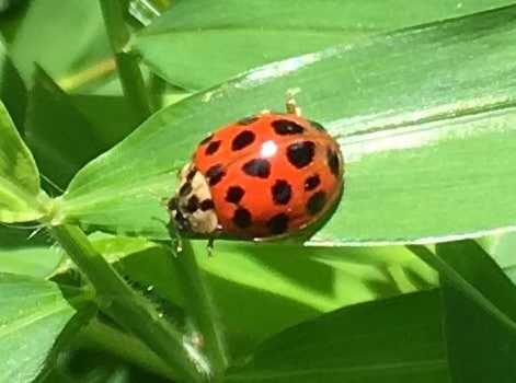 Not to be confused by the Asian lady beetle (Harmonia axyridis) introduced by the U.S. Department of Agriculture for biological control, first in Pennsylvania in 1978. They vary in color just as ladybugs do— from yellow, orange to red, but have a distinctive M-mark on their whitish heads as compared to our native ladybugs. And while they too eat aphids and such, they are the frustrating little critters that swarm inside homes to hibernate.