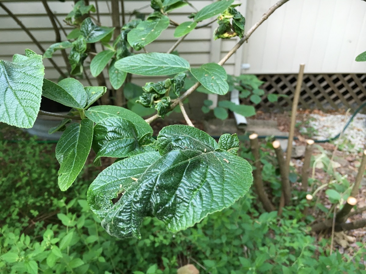 For sure many insects can cause havoc, like the aphids that devastated our three Leatherleaf Viburnum resulting in desperate measures to rejuvenate the plant. I cut the plants down to sticks in a moment of frustration (each of the multi-stems at different heights) and then tossed the infested foliage far, far into the woods. Better still would have been to throw the debris in garbage bags for the landfill, not that I wish to contribute to mountains of trash. But I’m ahead of myself in the story.