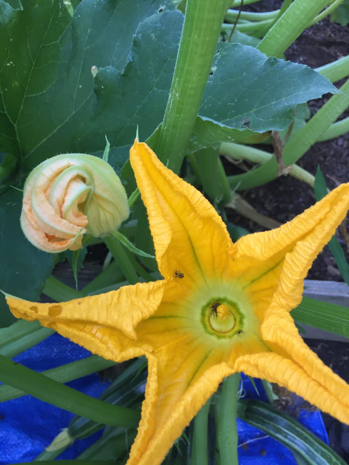 “There are many flowers, which are delicious, but no baby zucchini yet.” Eating the flowers is most likely why you don’t have zucchini, I didn’t say (not wanting to offend), which brings me to the birds and the bees of zucchini.