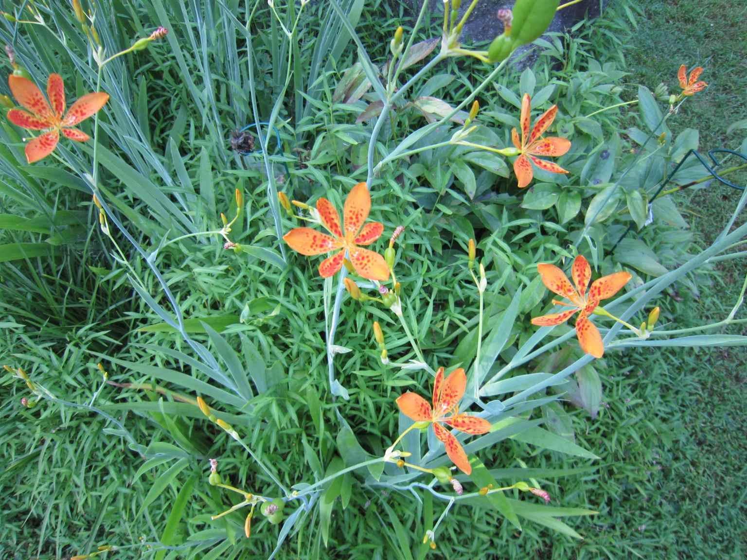 “They’re Blackberry Lilies,” Suzanne of Stillwater NJ said, a plant new to me. When I first visited Suzanne, they were in their glory despite being squelched by an infestation of Stilt Grass (Microstegium vimineum), the mini bamboo-like invader that came from shipping containers that seem to be taking over our world. Of all her perennials, only the Blackberry Lilies were competing heartedly with the Stilt Grass, and so, I guessed they too might be considered invasive. Maybe not! One of the joys of working with fellow gardeners is learning about unusual plants.