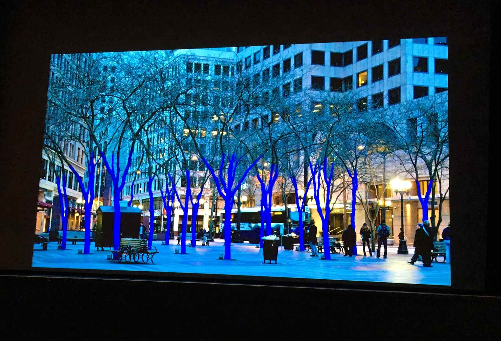 As Kon gave his passionate yet humble presentation, a slideshow of The Blue Trees scrolled behind him –the images startlingly contrasting the urban settings. He’s designed installations in Sacramento, Seattle, Albuquerque, Houston, Jacksonville, Gainesville, Singapore, Germany, and Australia, to name a few. The response of children captured in the slideshow was fairy-tale-like. Once small child’s excitement hugging a trunk could parallel an embrace of Cookie Monster, his color the same.