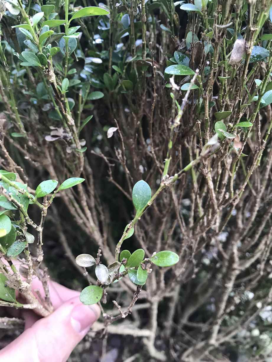 Boxwood Blight is caused by a fungus, Calonectria pseudonaviculata, and has been impacting plants in the UK for over twenty years. It arrived in the US in 2011 and has spread to over twenty-three states. It’s also called Shoot Blight as water and wind propel spores, thereby spreading quickly, making groupings of boxwood highly susceptible. Unlike other fungal boxwood diseases such as volutella where leaves stay on the plant, Boxwood Blight defoliates the plant in as rapidly as one week from infection while the branches remain green. Per the USDA’s Diagnostic Fact Sheet, it’s been found in some cultivars of three species of Buxus, specifically Common or European Boxwood (B. sempervirens), Japanese Boxwood (B. microphylla), and Korean Boxwood (B. sinica var. insularis). Pachysandra and Sweetbox (Sarcococca) can be hosts for the spores.