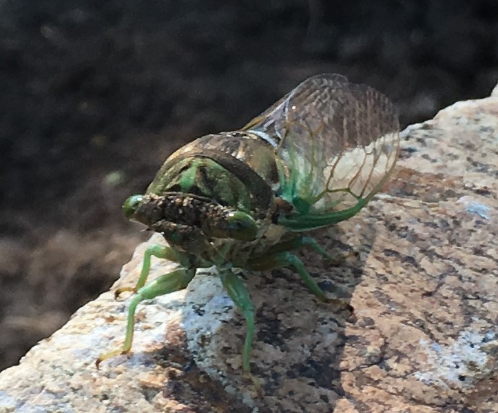 Just as the annual cicadas now buzzing in the trees, periodic cicadas emerge from the ground and molt to become adults with wings. Then they find their way onto deciduous trees and shrubs to mate.