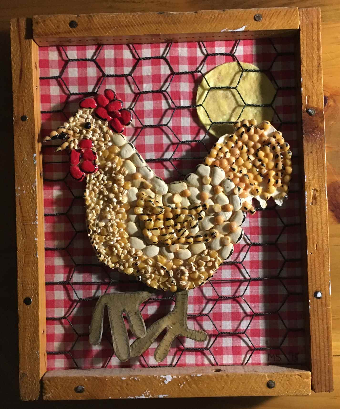 Another box of country decorations, no longer my style, was easy to put in the giveaway box, other than a chicken made of dried beans on top of a gingham-covered shadow box that I made for mom when I was a teen. Amazingly critters didn’t nibble the beans. I considered keeping it, but in the donation box, it went. It’s easy to pass things along if there’s a person or place that can use them. Throwing them out to rot in a landfill seems irresponsible.