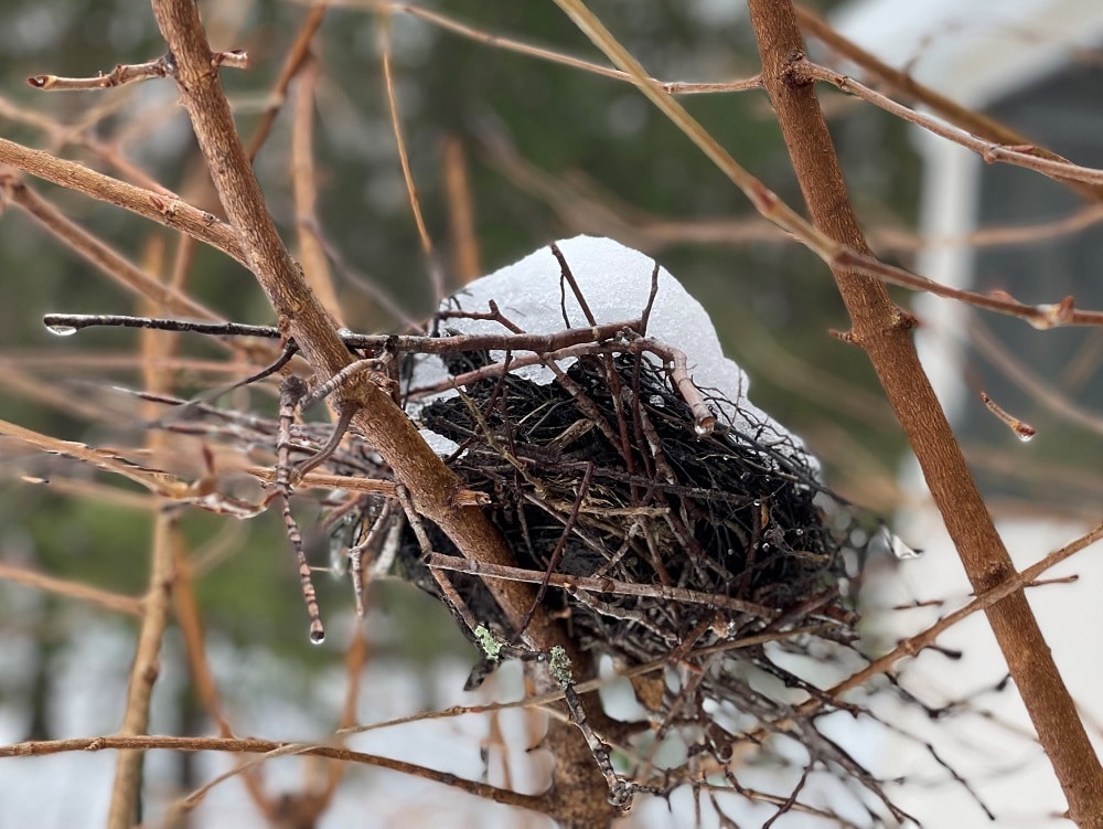 Sadly, a hawk took the young, and the parents left. As I look upon the nest now, in all its beauty decorated in fluff from last night’s snow, perhaps another family will come in spring.