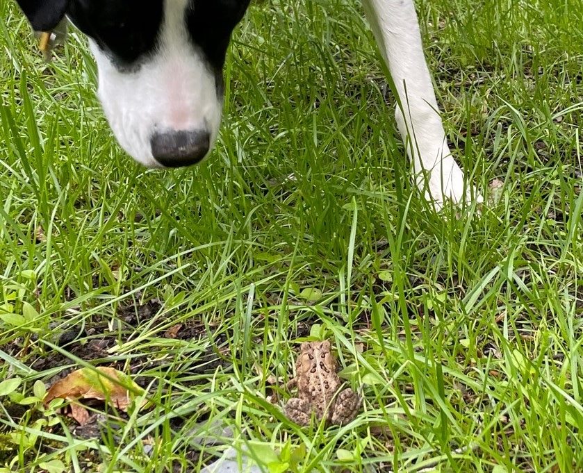 Hello fellow readers,  Jolee came upon an American toad in the lawn to the left of a drainage swale.  I’m glad she didn’t pounce for the kill, the fate of cave crickets, though we are grateful for her finesse. Our rescue pup is indeed earning her keep. The darn things adore the basement, with a few wanderers finding their way upstairs. Bringing a curiosity— do cave crickets benefit the garden?
