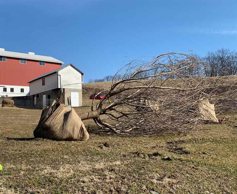 While walking Miss Ellie past a farm that changed hands a handful of years ago, I noticed large cherry trees in the field with root balls loosely wrapped in burlap. The trees were about six to eight inches in caliper. I’ll admit seeing them lying there for a few days tugged at my heart, but at least they had the burlap for protection. And based on their intended placement, the new farm owners were thoughtful about where to plant the trees.