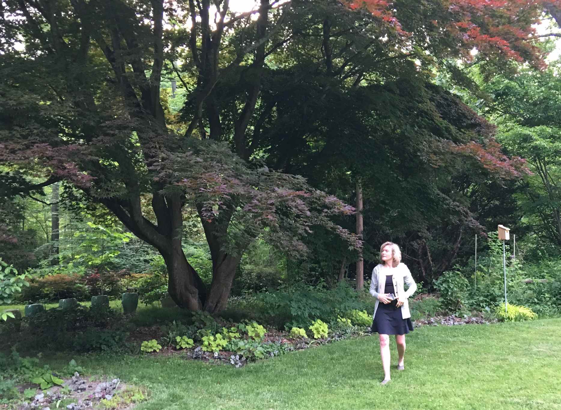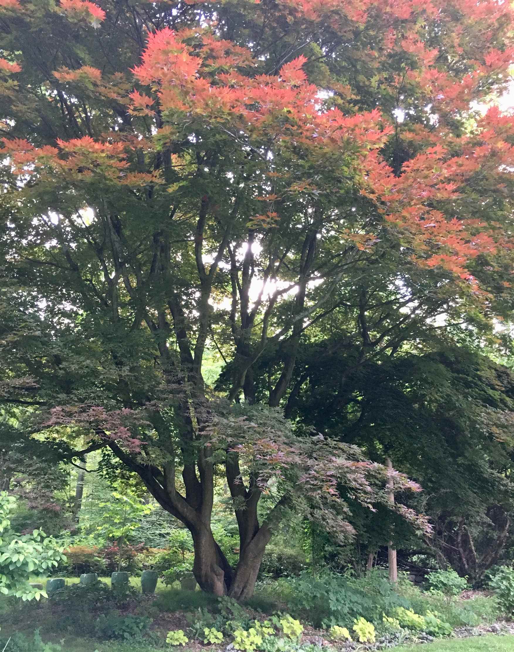 Of all the extraordinary plants, an old Japanese maple (Acer palmatum) captured my admiration. It survived sitting in wet feet for days after Hurricane Sandy. It looks like a sculpture with maroon leaves tinged red, vase-shaped, with smooth grey bark.