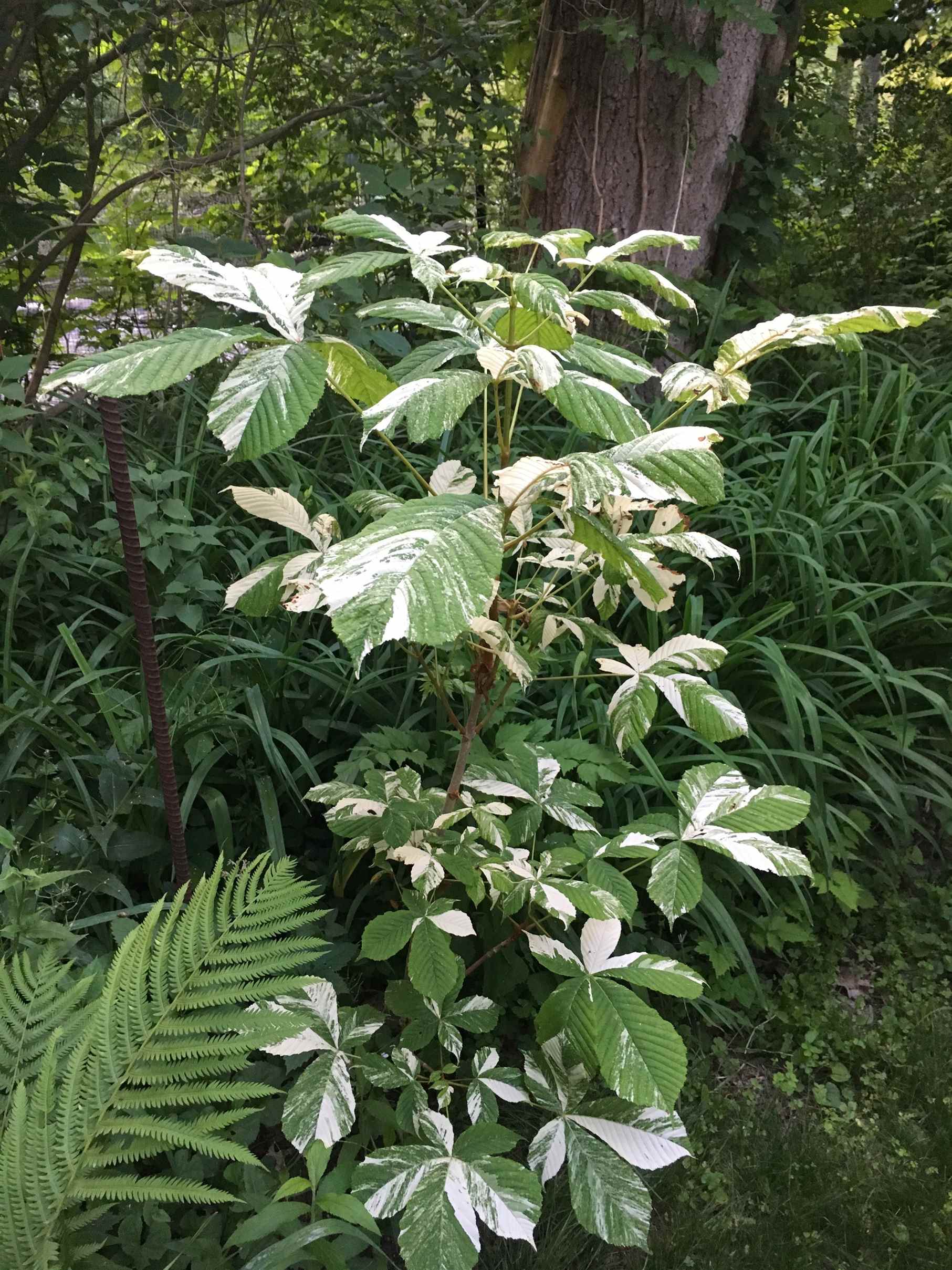 With gracious hospitality, they toured us through their gardens chockfull of unique species, many rare, like Variegated Horsechestnut (Aesculus hippocastanum’ Variegata,’ Zone 4) with striking streaks of white and green variegation on ten-inch leaves grouped like five fingers.