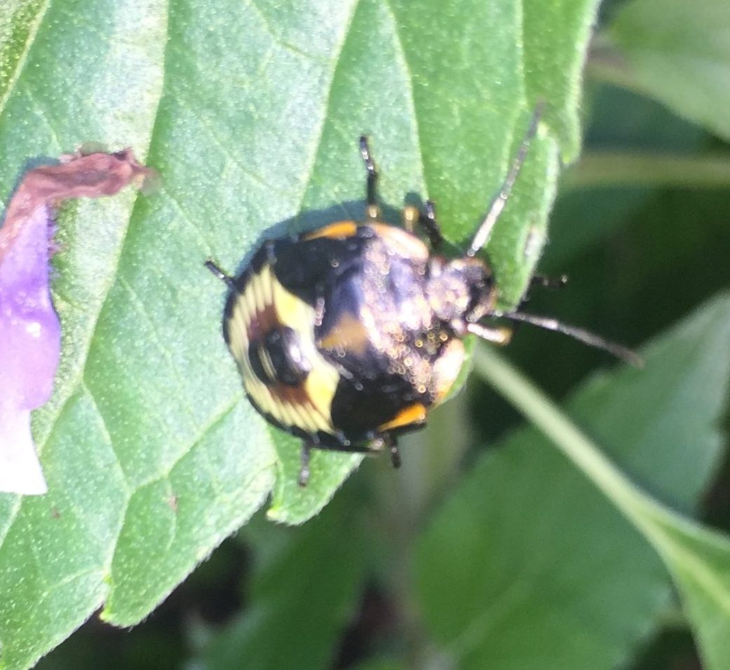 Thanks to those who braved the heat magnification of the glass conservatory during our pow-wow of garden dilemmas at the NJ State Fair. As always, critters were a hot topic. Lorraine of Sparta NJ, a Flower Show volunteer, master gardener, and friend who invited me to talk, came prepared with a photo of a large tick-like looking fella none of us could identify. He’s been sucking the stems of her hyacinth bean vine  and honeysuckle vine causing them to wilt then die. My colleague suggested her go-to organic insecticide Captain Jack’s Dead-bug Brew which contains Spinosad (spin-OH-sid). The naturally occurring soil bacterium that’s lethal to many insects was first collected from an abandoned rum distillery in the Caribbean. Fermented bacterium must work like a charm as it’s the ‘duct tape’ in Marty’s garden like neem oil is in mine. According to my buddy Dennis of Blairstown who knows much about bugs, Lorraine’s garden dilemma is likely the nymph of Twice-stabbed Stink Bug (Cosmopepla lintneriana), or a Green Stink Bug (Cinavia hilaris). Turns out the familiar Brown Marmorated Stink Bug (Halyomorpha halys) swarming houses aren’t the only ones that stink.