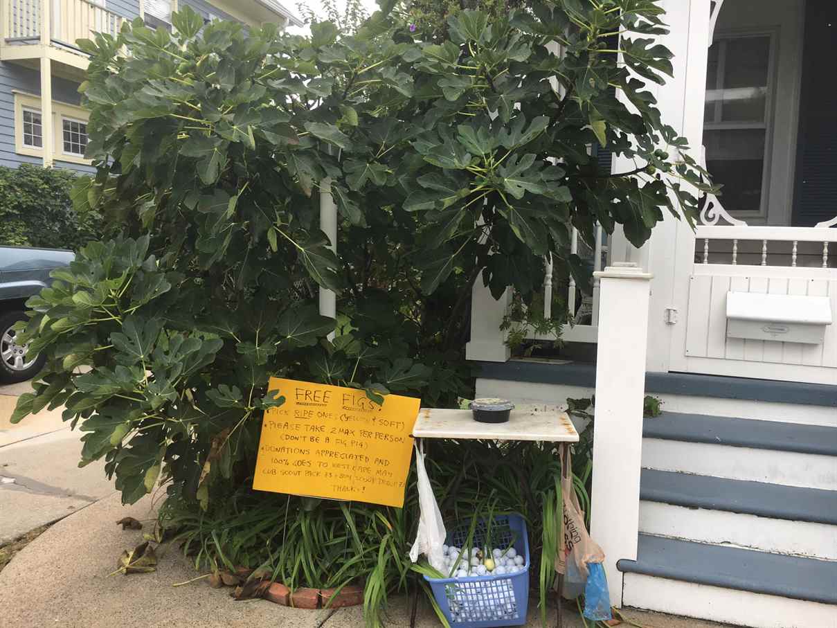 Walking closer to the beefy tree with its shiny course leaves, I noticed a sign: FREE FIGS in capital letters on a bright yellow board. Bulleted below are the rules.