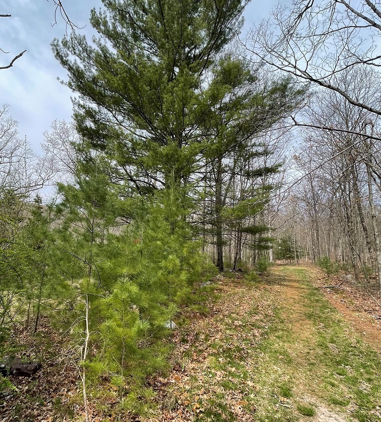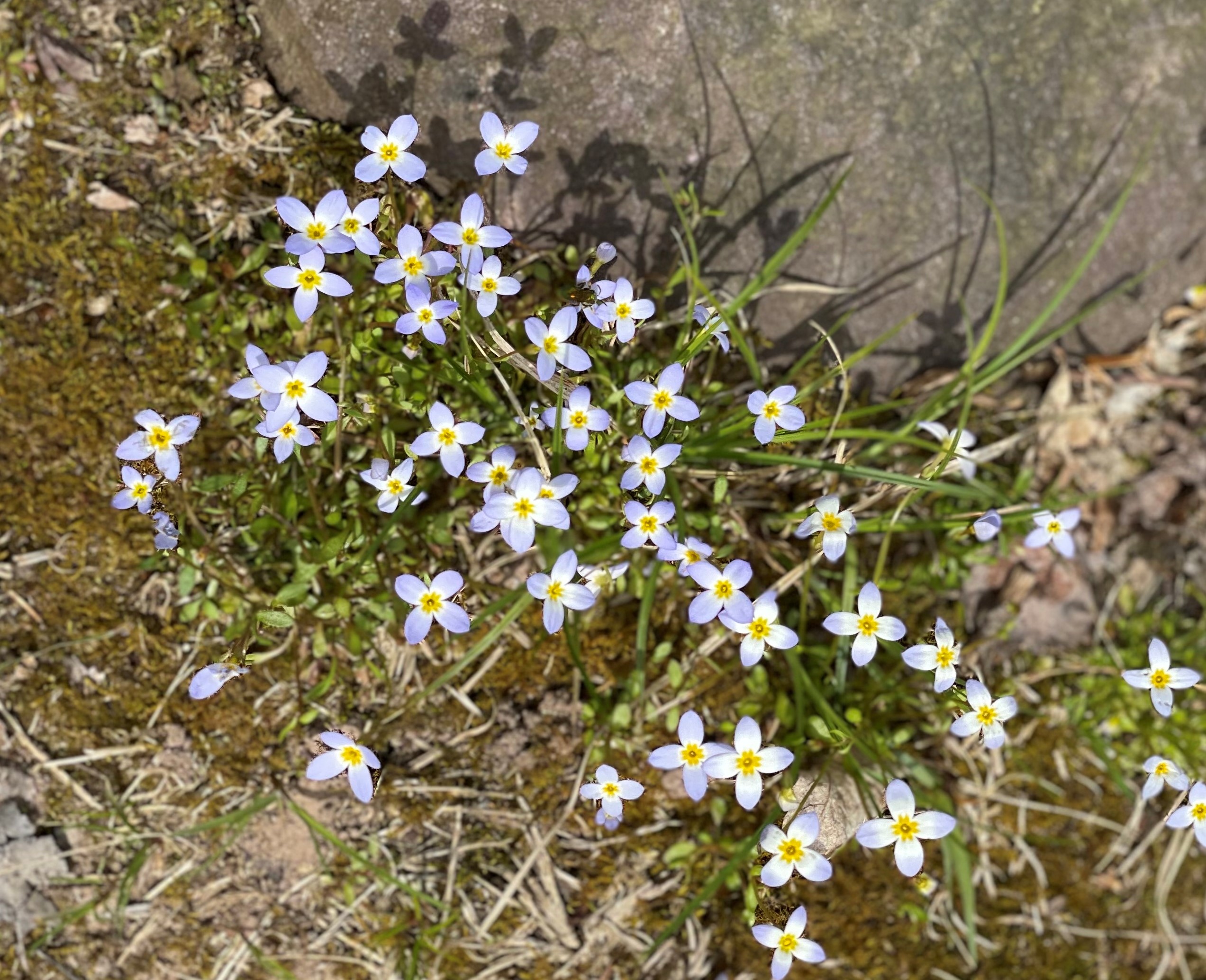 On the way to Blue Mountain Lake’s main lake, I marvel over the baby White Pines(Pinus strobus) below the mama trees. And starry light purple flowers, low to the ground along the trail. My buddy Dennis Briede, fluent in native plants, identified the Bluets (Houstonia caerulea) that grow on compacted tufts.