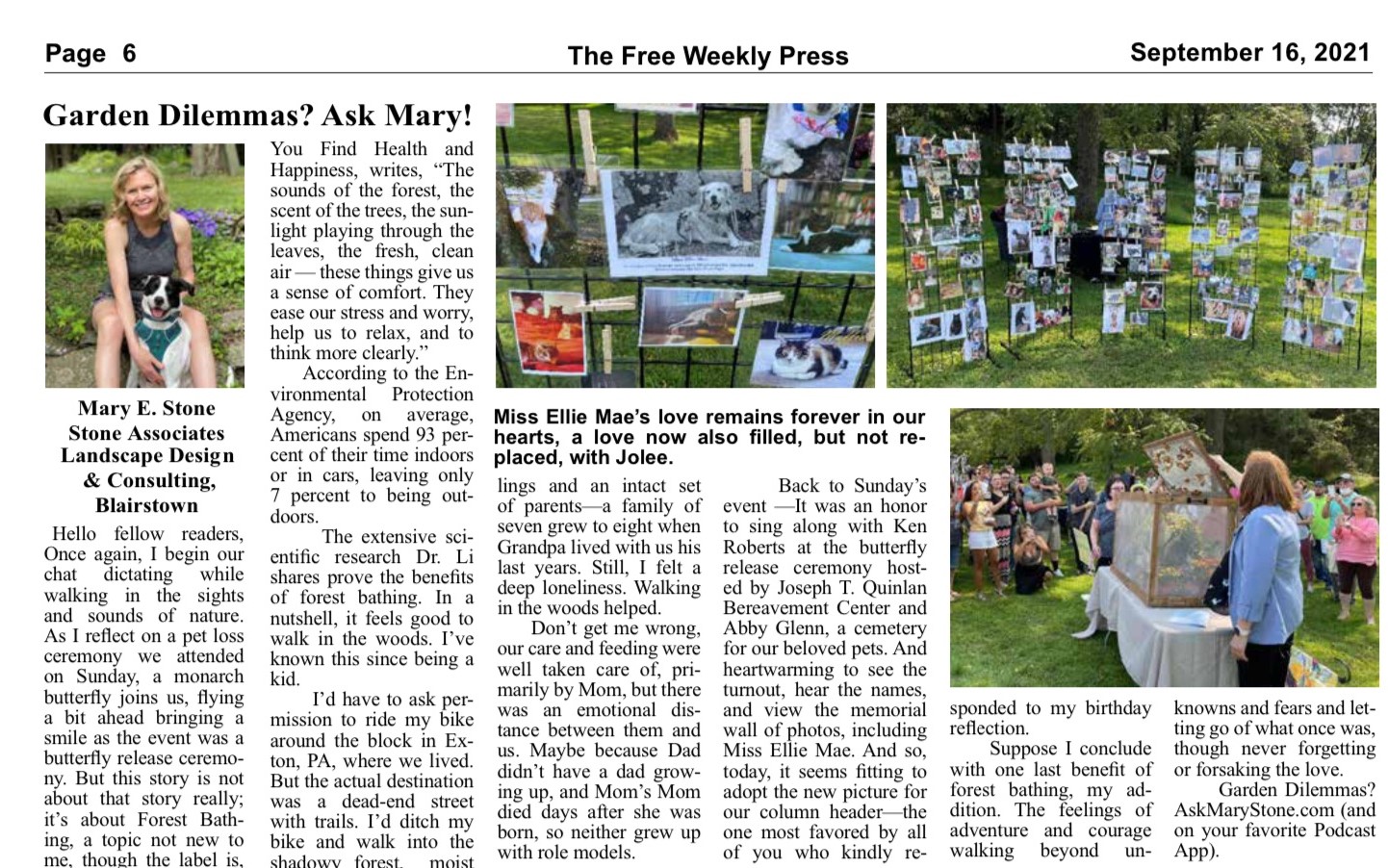 Hello fellow readers, Once again, I begin our chat dictating while walking in the sights and sounds of nature. As I reflect on a pet loss ceremony we attended on Sunday, a monarch butterfly joins us, flying a bit ahead bringing a smile as the event was a butterfly release ceremony. But this story is not about that story really; it’s about Forest Bathing, a topic not new to me, though the label is, thanks to Anita of Blairstown, NJ, who sent an article on the subject.