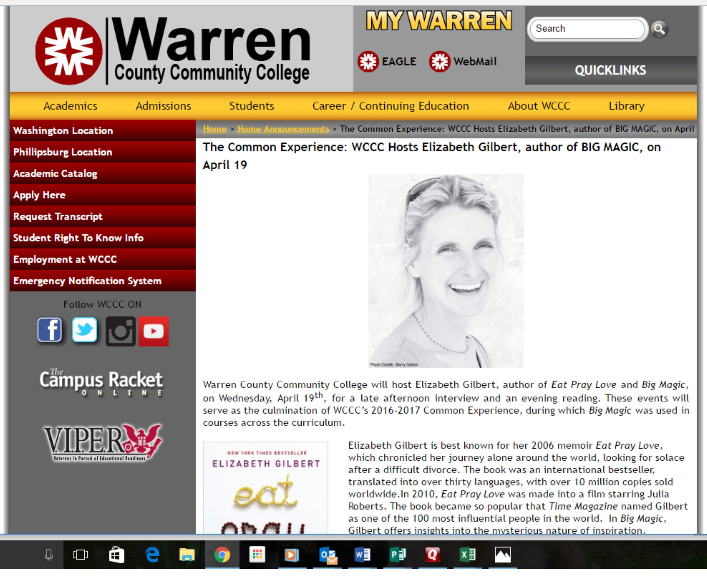 About Elizabeth Gilbert’s April 19, 2017 visit to Warren County Community College, Washington NJ: All are invited to this two-part free event (first come first serve), which begins at 4 PM in room E208 with an hour-long interview and Q&A. At 7:30 PM Elizabeth Gilbert will read selections of Big Magic followed by Q&A from the audience. Books will be available for purchase.
