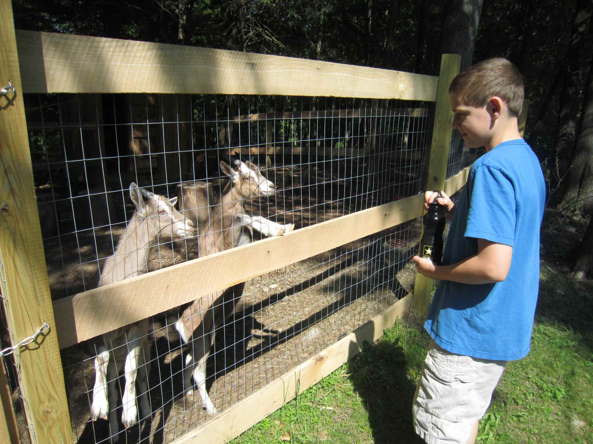 Tip 2 – “Don’t have a garden unless you have a fence,” advised this 12-year-old goat whisperer. They’ll eat just about everything, as I witnessed having a few fewer buttons when I left. They are charming and fun to watch as they follow Dad around the property; licorice-flavored goat treats in hand may have something to do with it.
