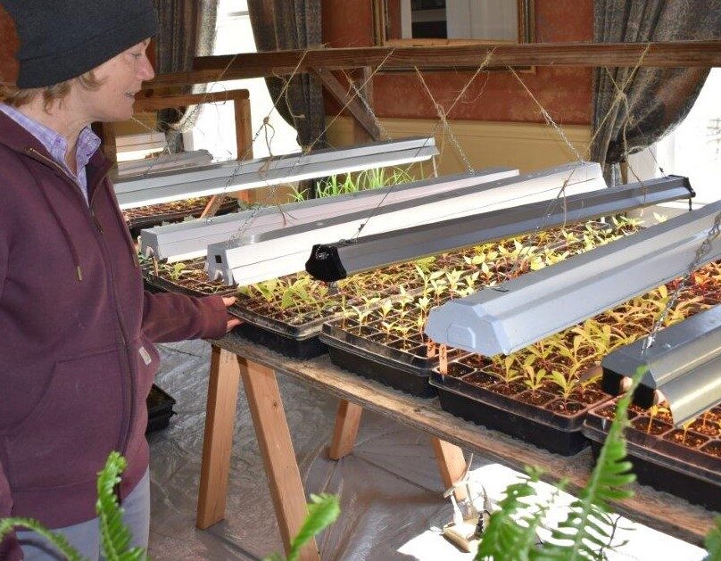 Once seeds sprout, they then need light, which is best from above. Patti suggests fluorescent or grow lights on chains suspended an inch above the plants, elevating them as plants grow. If the light source is too far away or from a window, plants will stretch towards the light and grow leggy. Also, baby plants need about 14 hours of sunlight per day, so daylight this time of the year is not long enough.