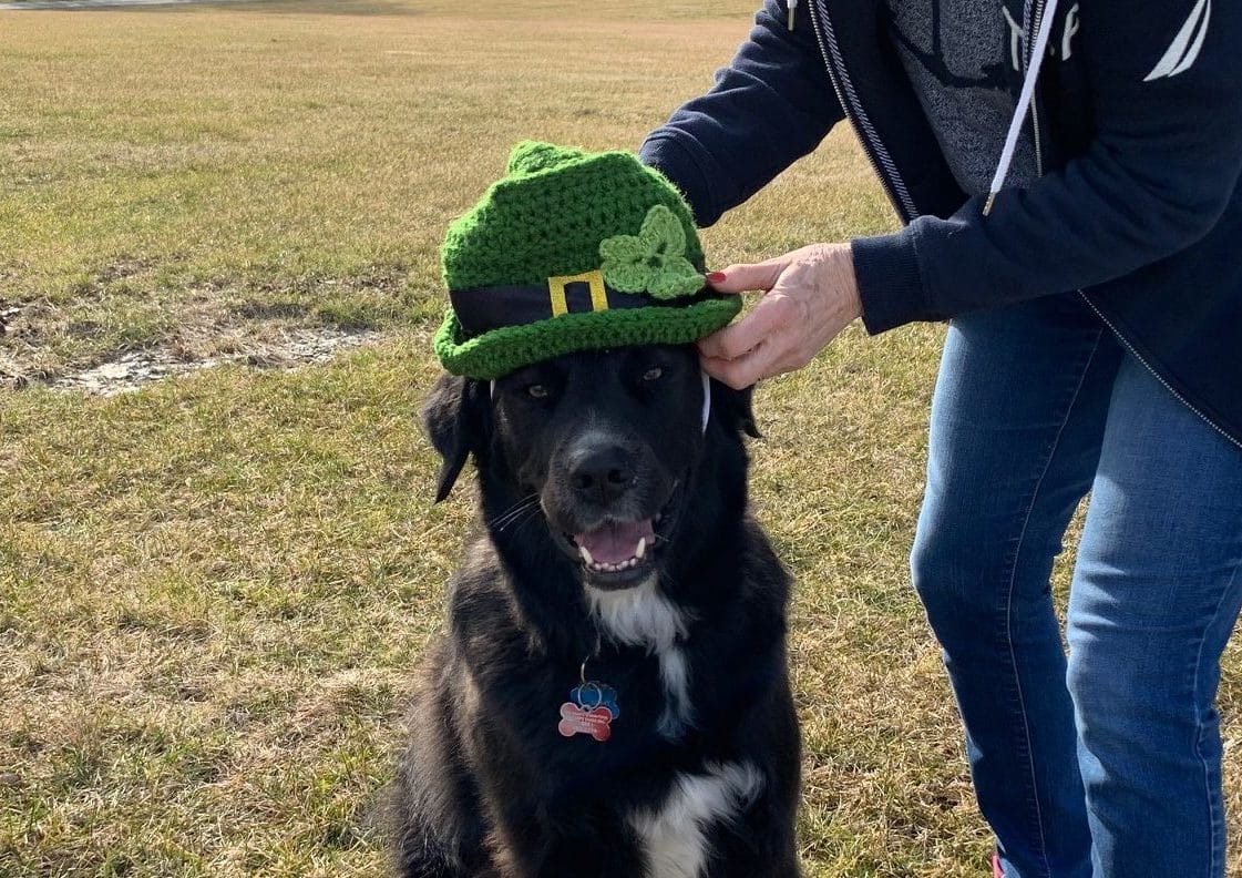 A new hat arrived for Murphy. He and his people (Alice & Neil) are certified with Creature Comfort Pet Therapy, spreading joy at nursing homes. :^)