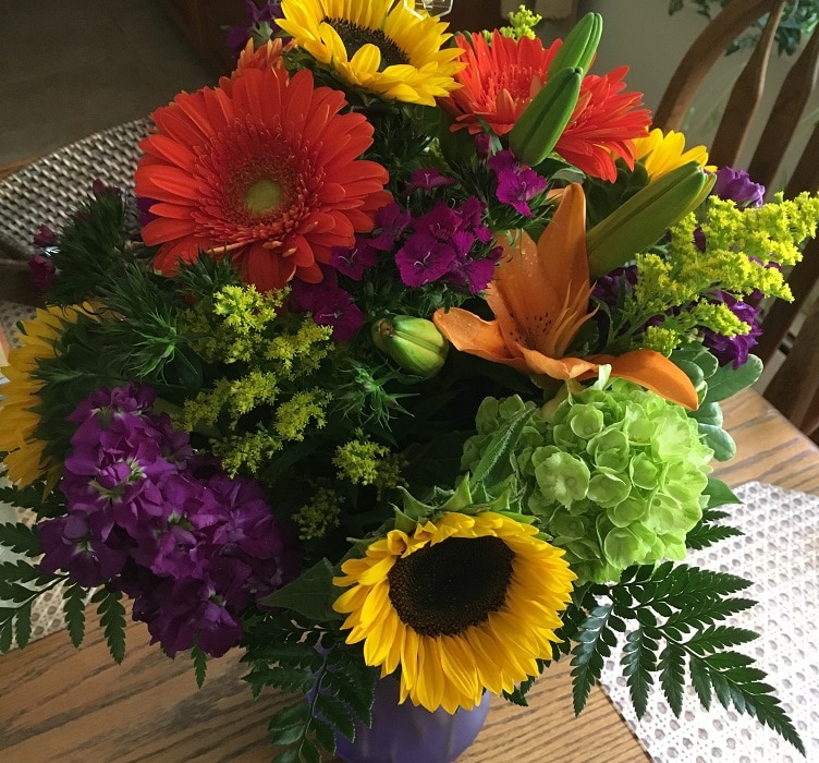 a bouquet of summer flowers including sunflowers and orange Gerber daisies. One day, I delivered flowers to a nursing home. It was a nice day, so a few residents were sitting in the vestibule enjoying the sun. When they saw me coming with a gorgeous bouquet, their faces lit up in anticipation. Then their faces fell when they realized the flowers were not for them. So I talked with them for a few minutes and continued my rounds.