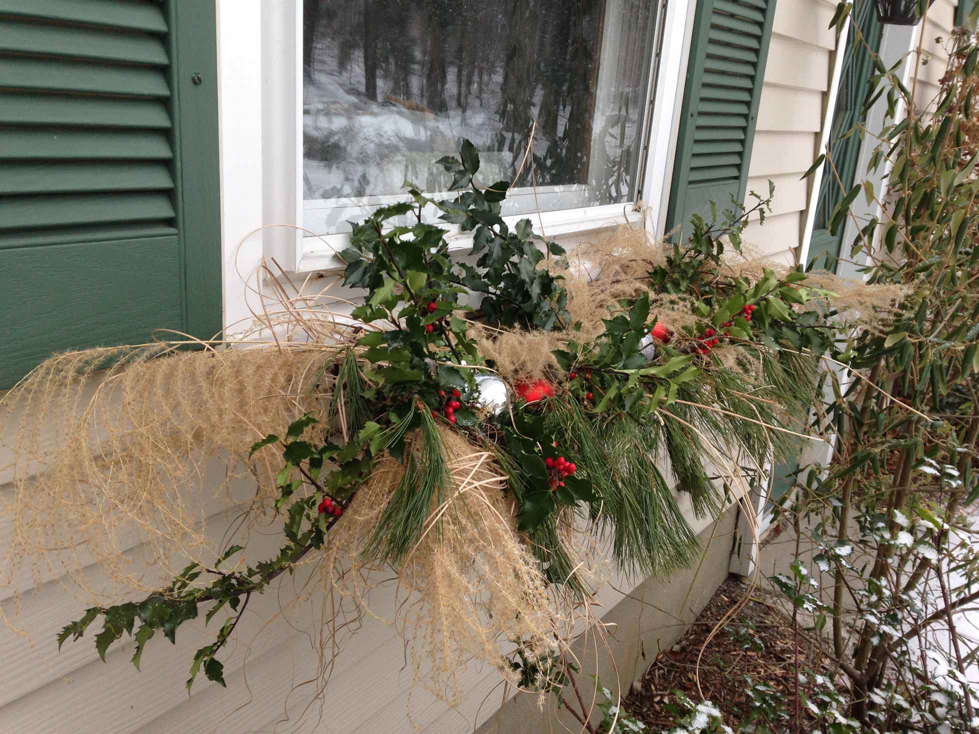 Last week, I shared about the buck rub on Ellie’s memorial holly (link below) and how branches ended up strewn along the base of the tree. While rubbing, deer often chew on lower branches, then paw at the soil and urinate to mark their territory. I saved the branches to decorate the window boxes—keeping them outside, of course, where pee-mail belongs. (That’s right, Jolee. You’re not the only critter who leaves messages.)