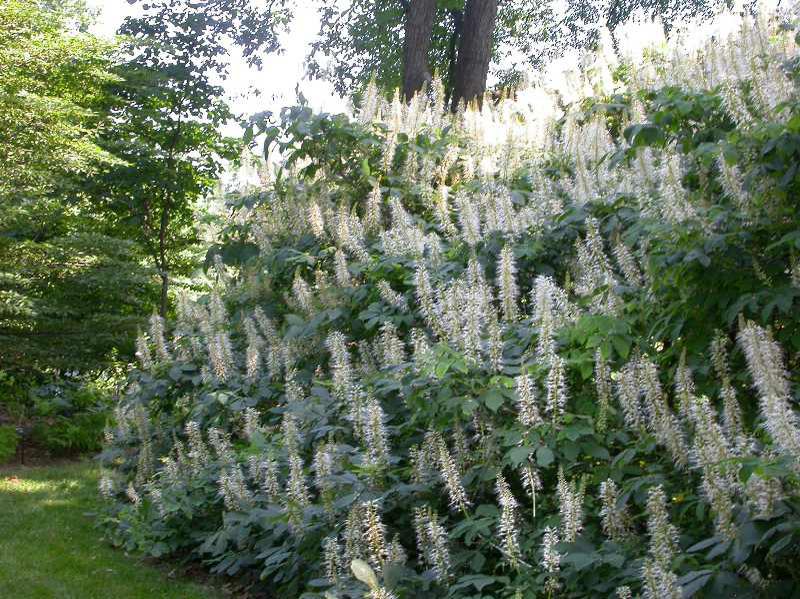 One of my favorite transition shrubs is Aesculus parviflora /Bottlebrush Buckeye reaching 8-12′ in height, and spread is excellent for massing, providing a wave of texture across the landscape. Full shade to full sun, although best with some shade hence ideal as a woodland buffer, this flexible fellow tolerates flooding and moderate drought and is deer resistant to boot. It flowers in June through July with showy white flowers that look like bottle brushes, hence its common name. Their flowers give way to glossy inedible, pear-shaped nuts (buckeyes) encased in husks.