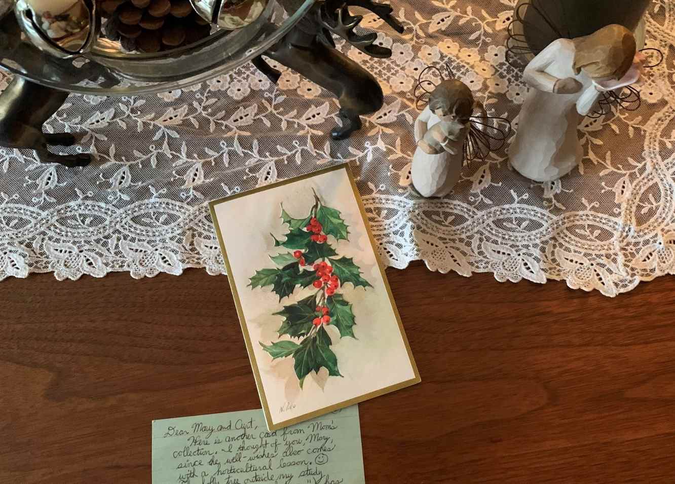After finding the Christmas Tree Legend card that evening, I began decking the halls. There’s a green bin of cherished ornaments my sister gathered for me that I saved for last. What fun to discover a Christmas card with a holly branch on top of the treasures. Inside was a note on a 3 x 5 card. Mom always carried 3 x 5’s in her pocket. She stacked them on the counter and next to her reading spot to jot down to-dos and tidbits of wisdom she came across.