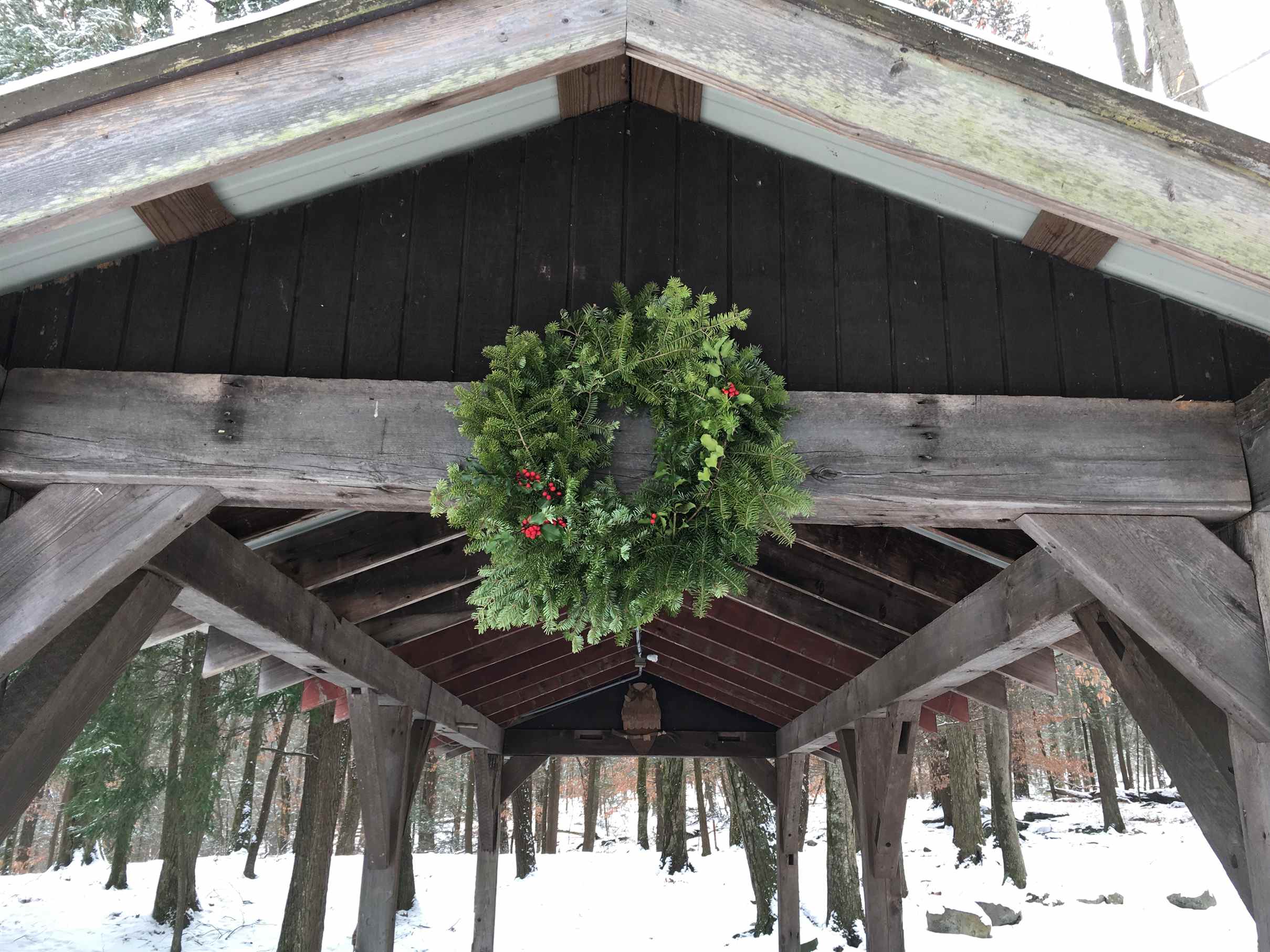 After the photo moment, I hung a gifted wreath from dear friends adorned with cypress branches, pinecones, and sprigs of sage. Then moved the undecorated stand-in and hung it above the covered footbridge over the pond, adding a few stems of berried holly to gussy it up. It could use a red bow, but the one I had handy was classified as trash, per Curt. It did look worn but served many years decorating the wooden sled left behind by the previous owners. I often wonder if the sled is sturdy enough to ride down the front yard (or am I ?…smile), then think a rocky landing in the brook below may be too risky.