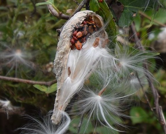 The milky white substance that gives the milkweed its common name contains a toxic chemical (cardiac glycosides). And so, only a few insects besides monarch butterfly caterpillars have adapted to ingesting it. There are milkweed tussock caterpillars, oleander aphids, long-horned milkweed beetles, and, as it turns out, large and small milkweed bugs.