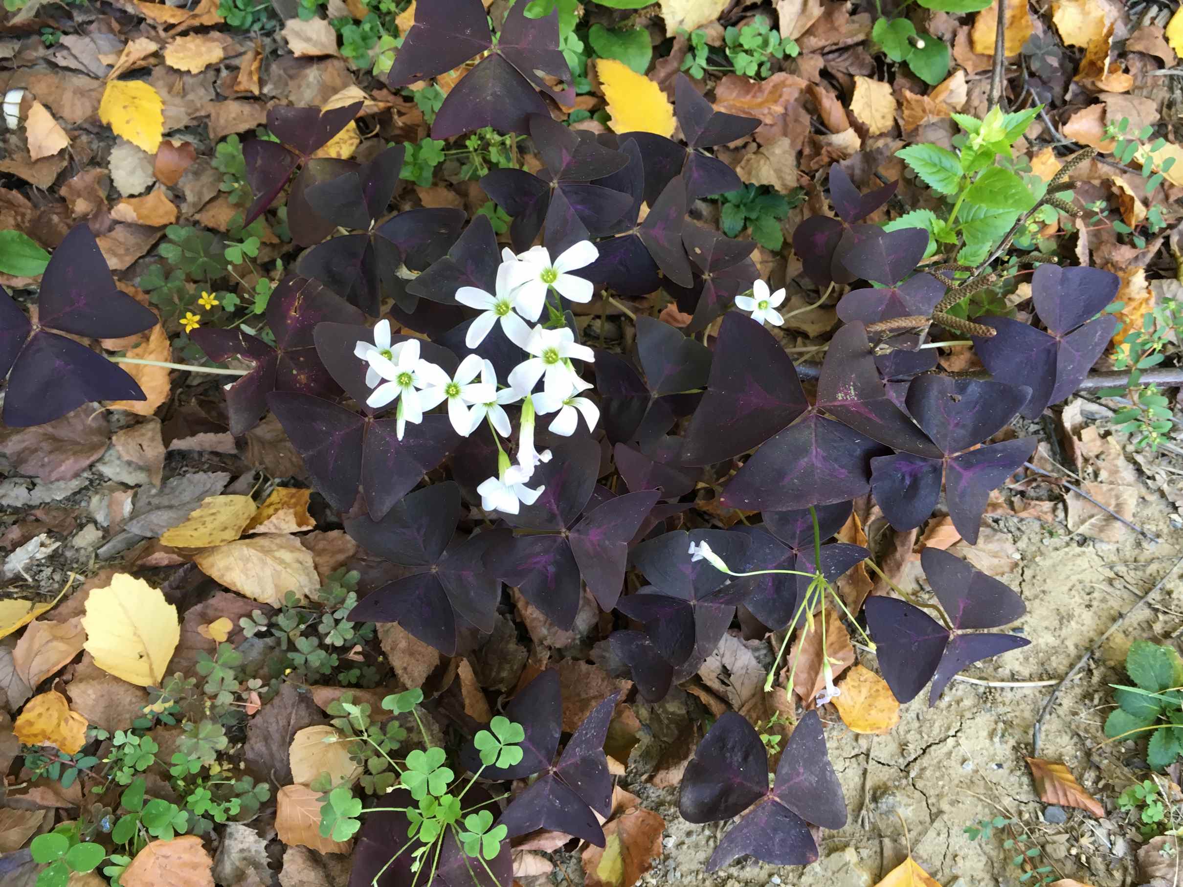 Another miracle is her Oxalis triangularis, commonly called Purple Shamrock or Love Plant due to its three purple heart-shaped leaves. It’s typically a houseplant as it’s hardy in zones 8a to 11. Mom J is in zone 6b, yet hers is thriving outside. True, her charming little garden is in a microclimate tucked next to the foundation. She insisted I take a portion of her Love Plant home.