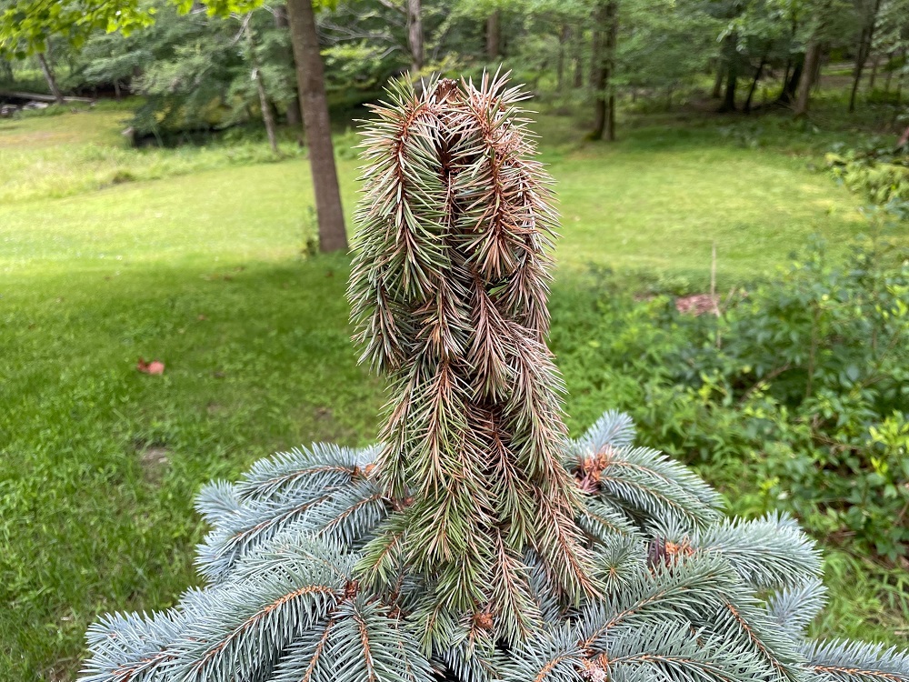We’ve chatted before about the devastating fungal diseases of Needle Cast or Canker Disease, blue spruce being the most susceptible (link to the column below). Both show similar symptoms of needle dieback, often from the bottom up, so seeing Ellie’s treetop first drooping before turning brown confused me.