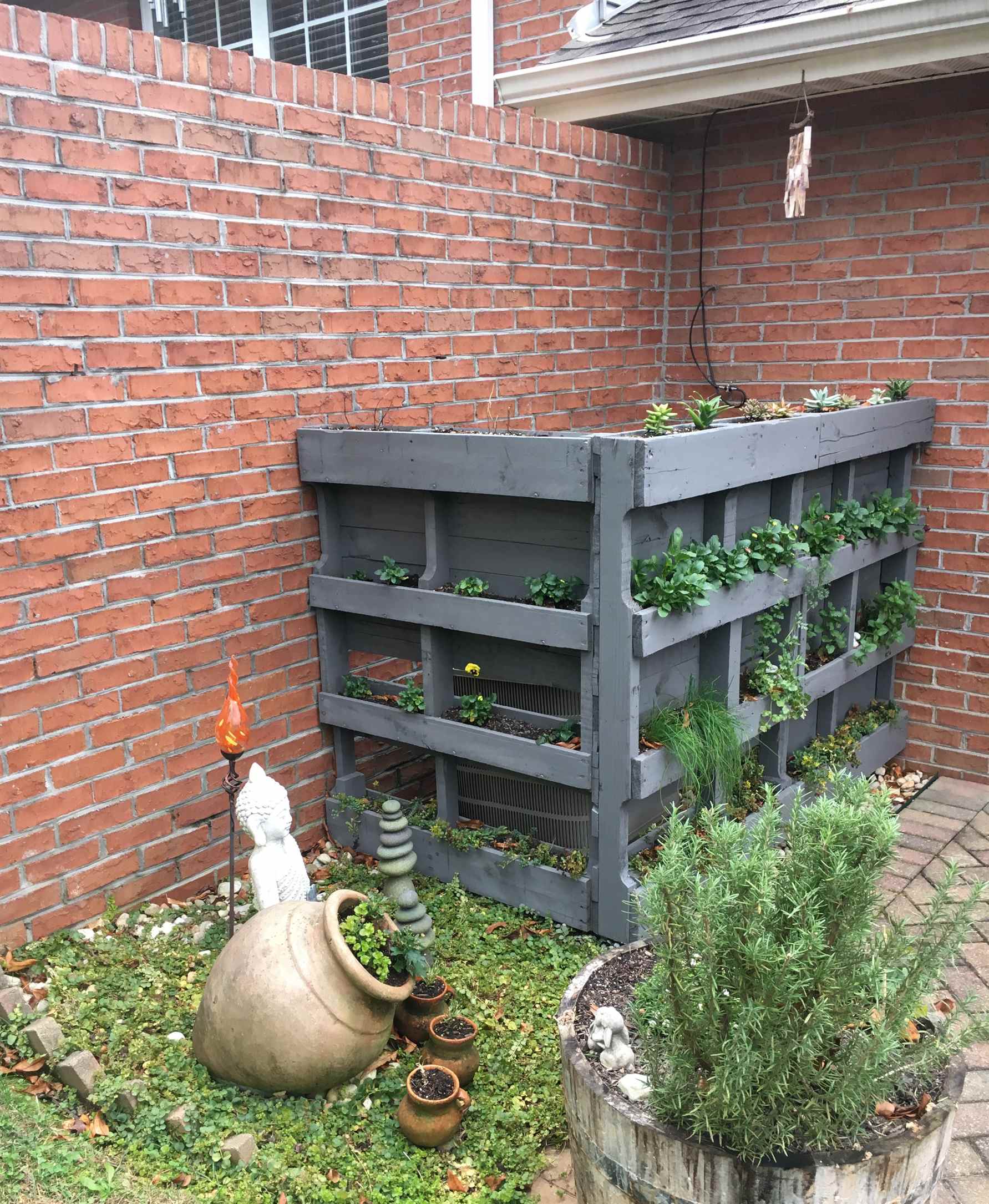 His clever pallet screening is stained grey to match their wooden table and is adorned with comical face sculptures hidden behind an assortment of succulents and herbs. “Impressive, my brother! A perfect way to solve the in-your-face AC dilemma.”