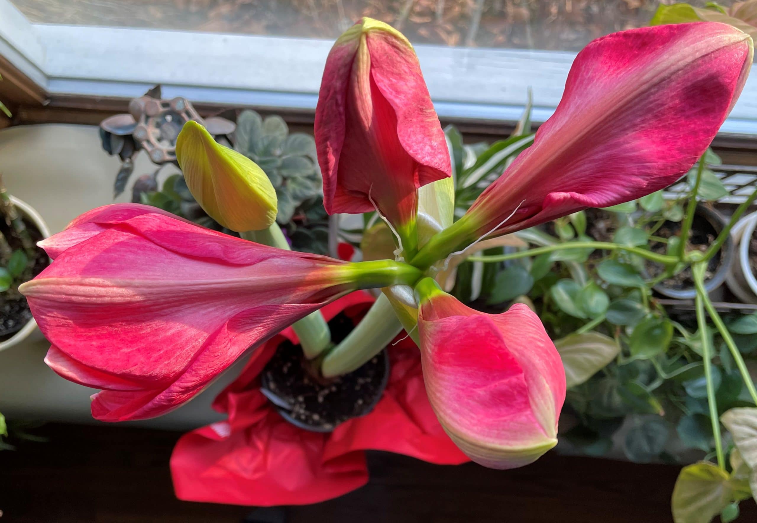 I adore the gift of amaryllis already in bud received on Thanksgiving. Watching the alien-looking beefy blooms open, badly bending the stem, makes me wonder if amaryllis like to party like paperwhites. No kidding. A continuous drink of alcohol keeps paperwhites from toppling over, unlike most of us (smile). Perhaps it works for amaryllis, too?