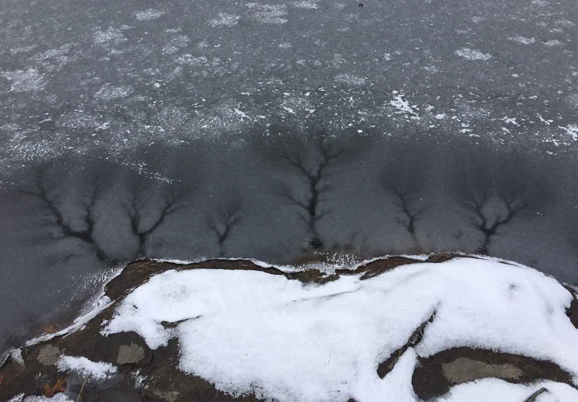 As I glanced over to Ellie exploring the coast of Catfish, I noticed enchanting formations on the frozen lake. I looked more closely and saw in the etchings what looked to be an island of trees. A magical landscape.