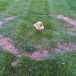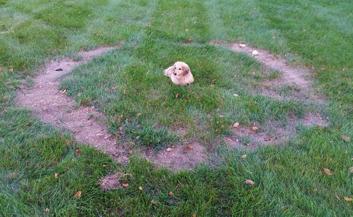 large brown ring shaped patch on lawn with a dachshund dog in the center
