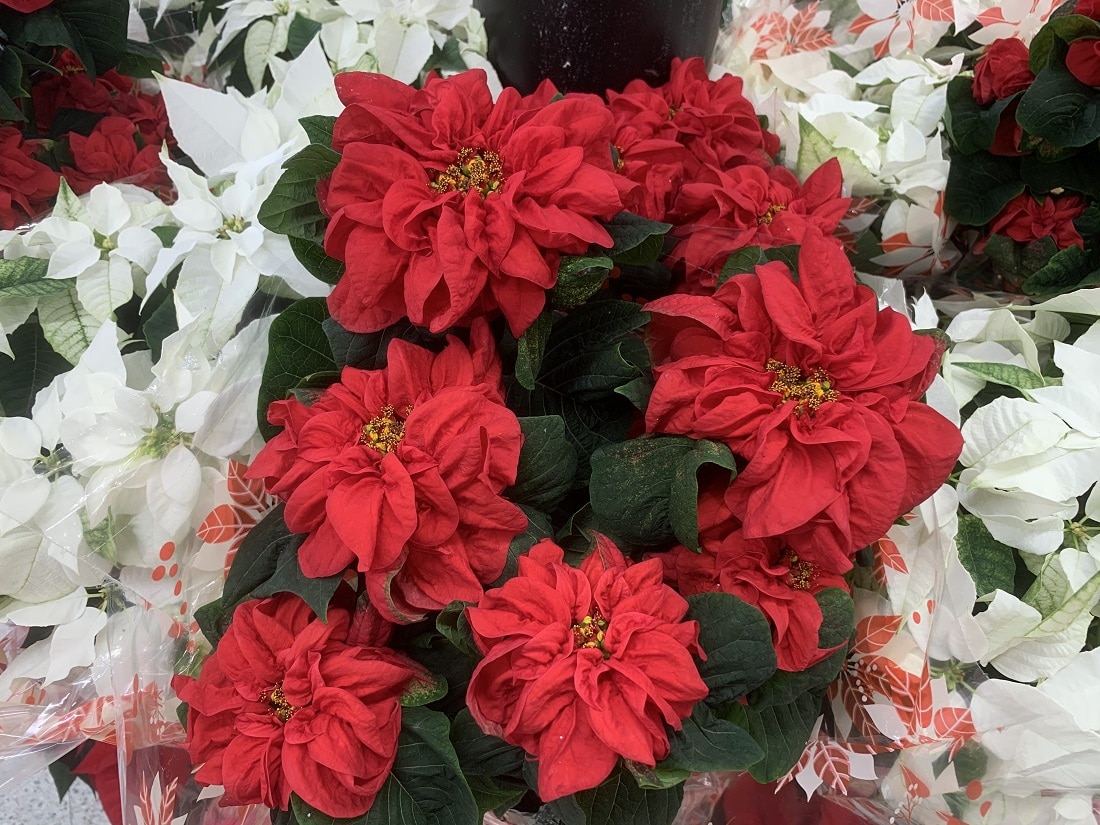 Hello fellow readers, The other day, while shopping for groceries, I stumbled upon an array of poinsettia varieties arranged at the floral department entrance. Hopefully not annoying other shoppers, I snagged a bunch of photos to capture their beauty. Of course, there were the traditional red and white ones. Intermingled within were cream-colored poinsettias and one mottled pink with what looked like red paint spatters. You know, how they taught you in art class as a kid using a toothbrush?