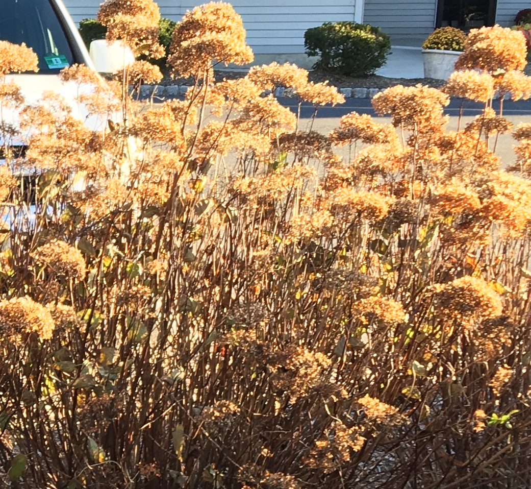 Most know how lovely ornamental grasses are left standing. Then there are the pompom-like black-eyed Susan seed heads (Rudbeckia hirta) that are especially cute frosted with snow. However, “rude Becky” can make too many babies. The same can be true of purple coneflower (Echinacea purpurea), so I leave only a few seed heads in key spots for winter interest. The new growth of Butterfly Bush (Buddleja davidii pictured above) looks like starbursts. They also have prolific seeds that disperse easily, so many categorize them invasive. I cut off the dry seeds, dispose of them in the takeaway trash, and prune back the plants for a tidier display over winter. Then come spring, they’re cut down to a foot high to rejuvenate each plant.
