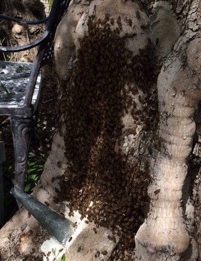 Linda’s first colony of honeybees inundated their sixty-year-old olive tree in February 2017. I remember during a visit convincing her the tree, though technically too close to the front door, should remain. Mr. Olive has such character, with multiple gnarly trunks bursting into a dense green canopy, offering a shady seating spot below. But with all the bee activity, there’s no sitting under the tree. More problematic is their dog Sugar had a near-death experience when she was stung.