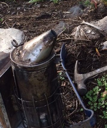 Smoke from native wood is used to calm the bees. A temporary Box Hive with pheromones was set below the tree to entice the bees to enter.