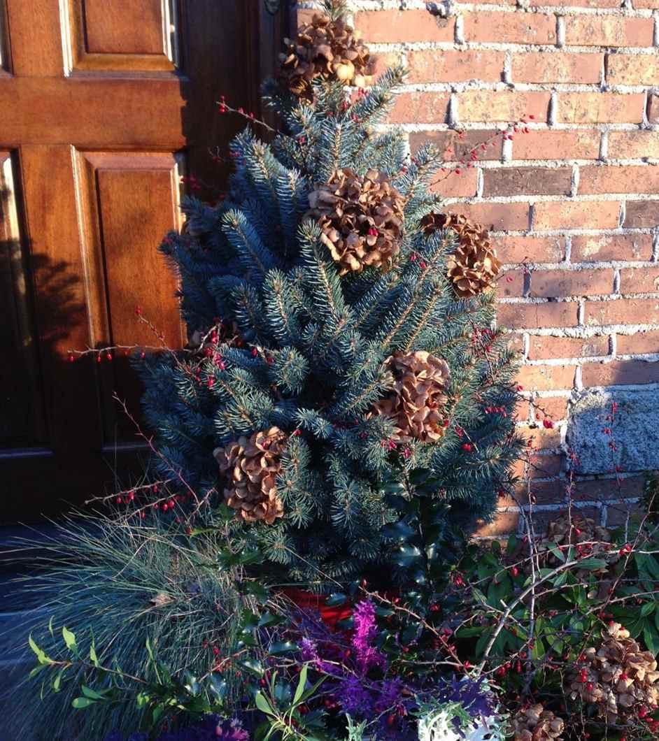 Why not move your undecorated tree outside, keeping it in the stand? Then add heart-shaped ornaments for Valentine’s Day, shamrocks for St. Patrick’s Day, or any other wintery decorations or finds from your garden that tickle your fancy.