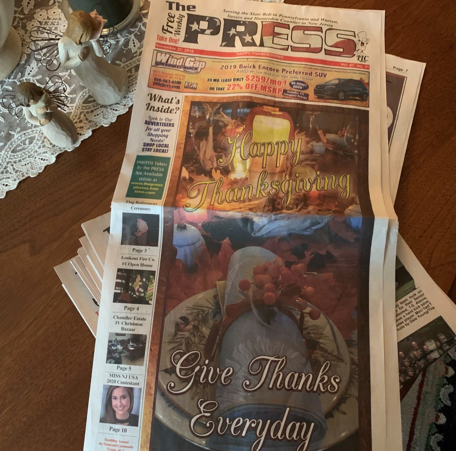 I didn’t realize until I saw our paper on newsstands last week, with its colorful front-page greeting, that it was the official Happy Thanksgiving issue. Here I thought this column would be my greeting of thankfulness to all of you for the gift of our weekly chats. Time sure has a way of sneaking up on us. The good thing, though, is that Thanksgiving is about giving thanks. And giving thanks is timeless, universal, and a practice for every day.