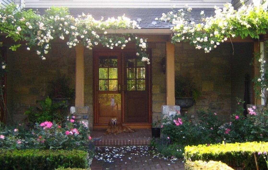 Marty’s magnificent Dr. Van Fleet Climbing Rose above and Knock Out Roses below. Canine kid, Keswick, is keeping watch.