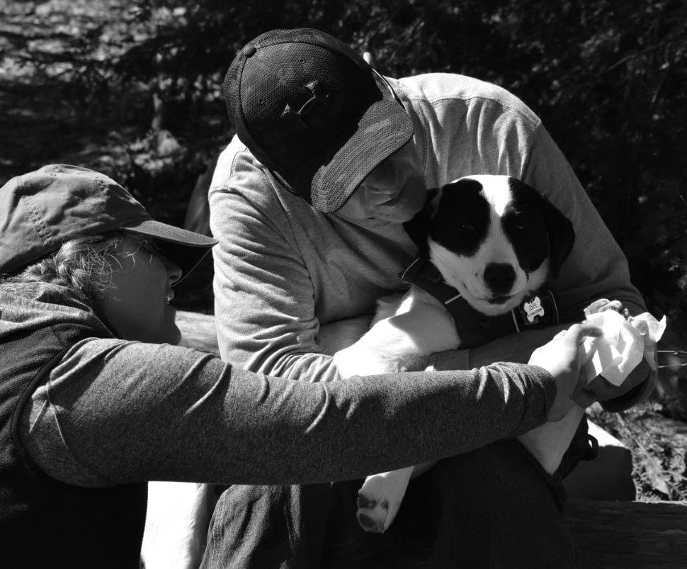 One gal hands the tweezers to Curt, but I couldn’t keep Jolee from squirming out of my grip. She offered to step in as Curt held her, not an easy task; our poor pup was in such pain. One by one, the angel hiker managed to get the remaining quills out.