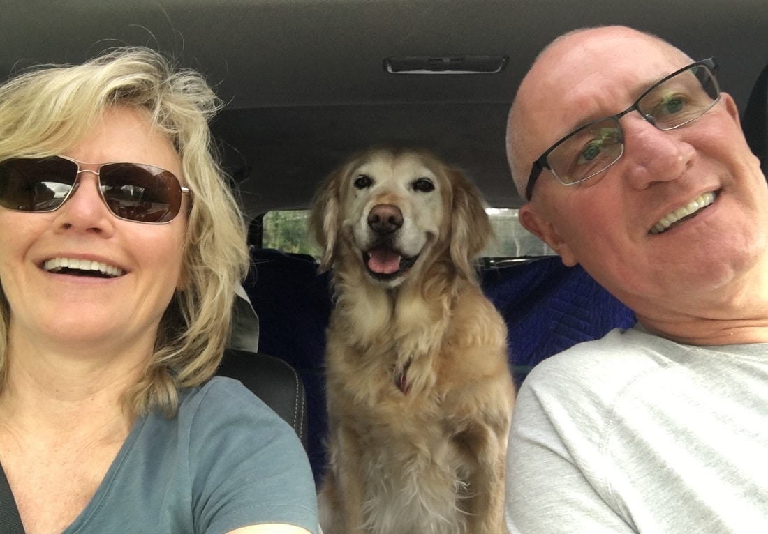 a selfie of a man and woman in a car with a golden retriever