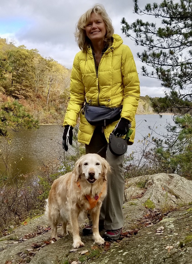 Blonde woman in a yellow coat wiht a golden retriever on a leash out in the woodsWhile walking among the trees is a lifelong passion, it wasn’t until Miss Ellie’s arrival that walking became a daily routine. On trails or along the road, walking was the only way to calm my then foster dog filled with heightened anxiety due to her first year of life.
