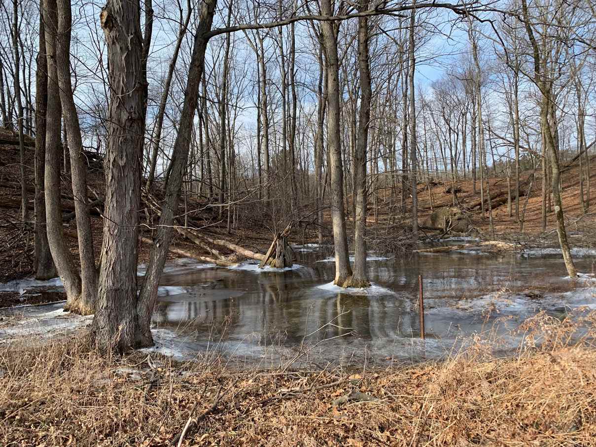 What a weather pattern we’ve just endured, from snow turned to sleet, followed by zero degrees that turned trees into glass. Then, temps rose to the mid-fifties as deluges of rain rolled in. The Jacksonburg Creek, where we live, became a roaring river overflowing fifteen feet beyond the normal creek edge.