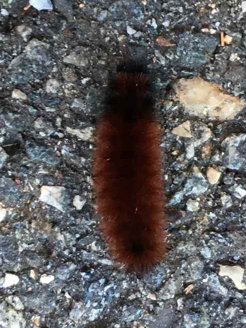 You likely know about the legend of woolly bears predicting winter. The narrower the reddish-brown band, the harsher the weather. They say there’s no scientific proof, and from my observation, their band fashions run the gambit. From the classic black ends equally sized with a reddish-brown middle to all brown or all black. Even an all-blonde fuzzy crossed the road. Then there are those with only one black band, a popular style this season.
