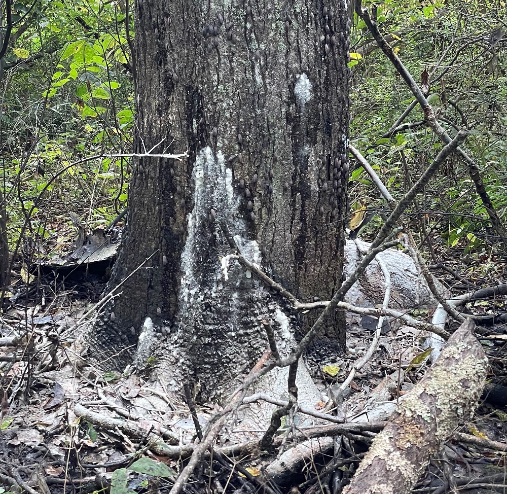 It turns out the sickening smell from the Tree of Heaven is the fermenting sap caused by Spotted Lanternfly’s feeding damage leaving dark streaks down the trunks. Then there’s the sugary, sticky liquid they secrete called honeydew, attracting bees and wasps—the honeydew now covered with black mold.